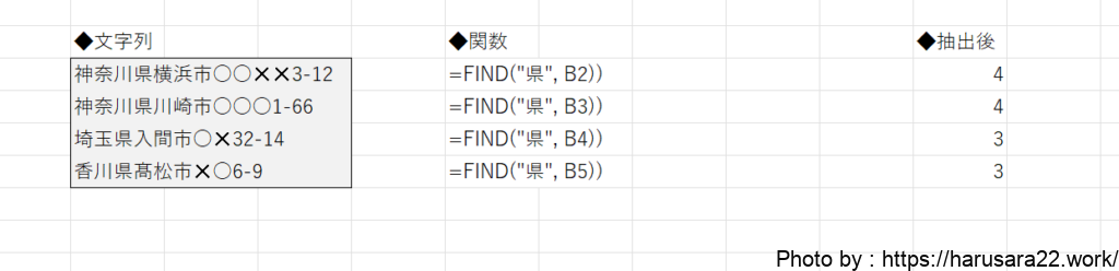 =RIGHT(B2, LEN(B2) – FIND(“県”, B2))