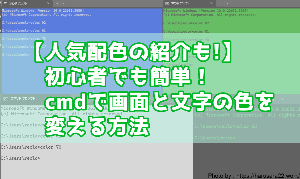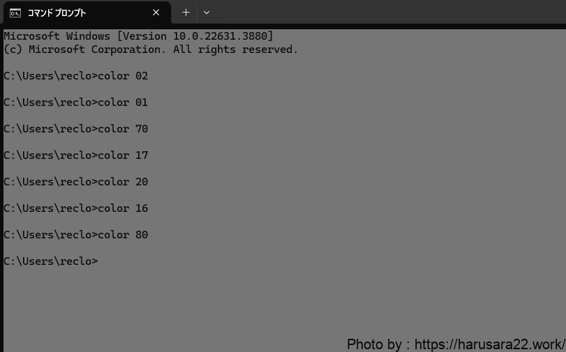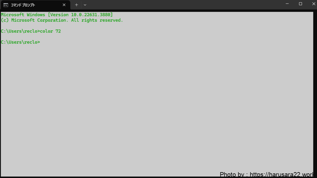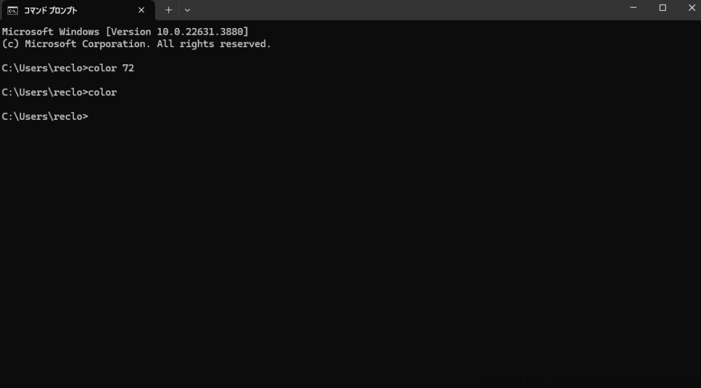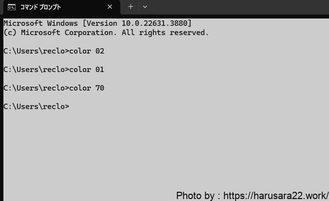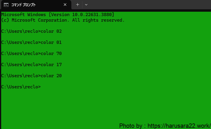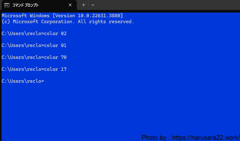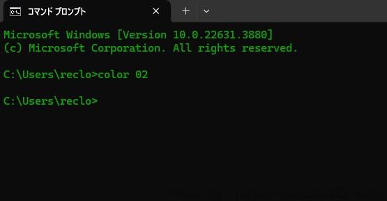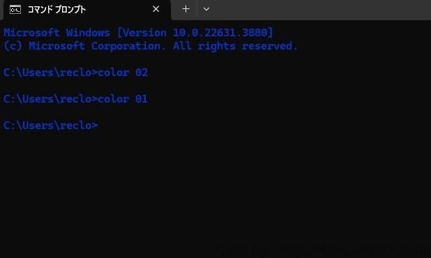 コマンドプロンプトの背景色を変更するには、color コマンドを使います。