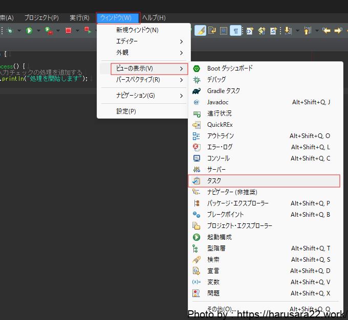 ウィンドウ→ビューの表示→タスクを選択 - すると「タスク」ビューがエディタ下部に表示されます。