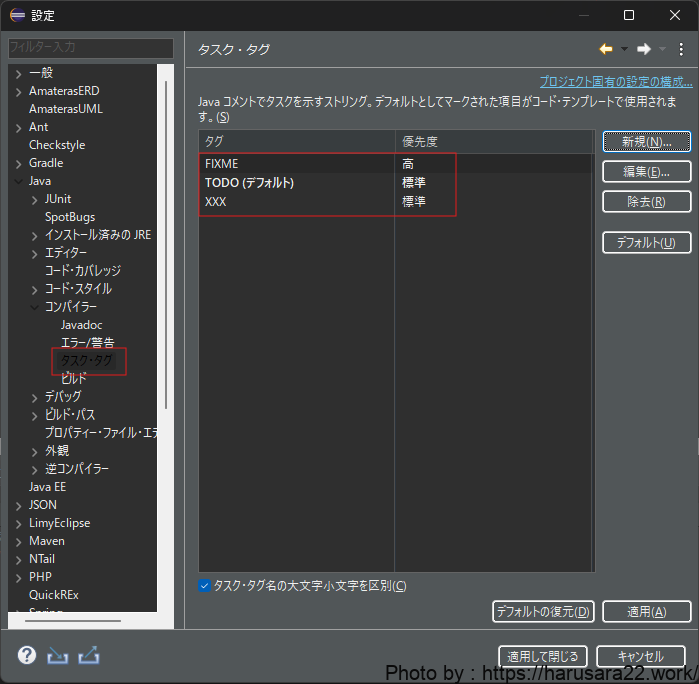設定方法:ウィンドウ → 設定 → Java → コンパイラー → タスクタグ