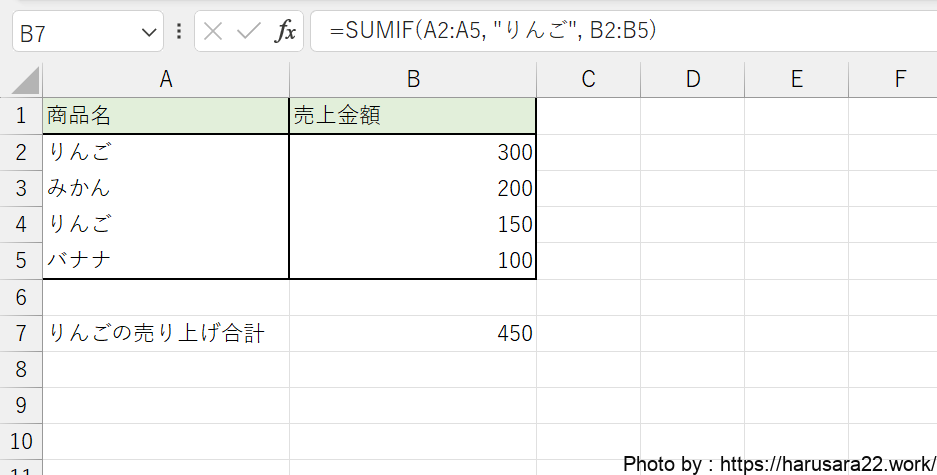 =SUMIF($A$2:$A$5, “りんご”, $B$2:$B$5)