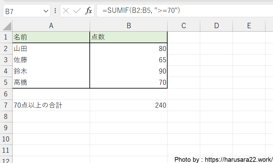 例2:指定した点数以上の合計を出す(条件に不等号を使用)