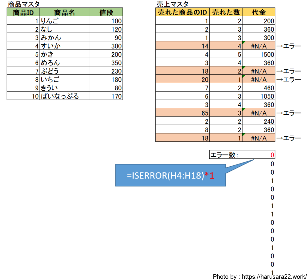 ISERROR関数の結果に「1」を掛けてあげると