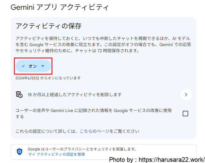 Google Geminiを利用する場合も、アクティビティの管理画面から学習の設定を変更できます。