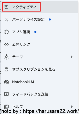 Google Geminiを利用する場合も、アクティビティの管理画面から学習の設定を変更できます。