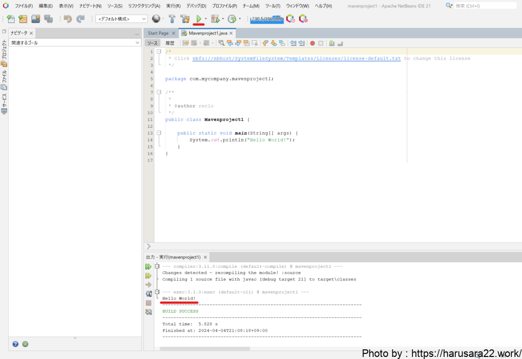 実行ボタンを押下することでJavaファイルを動かすことができます。