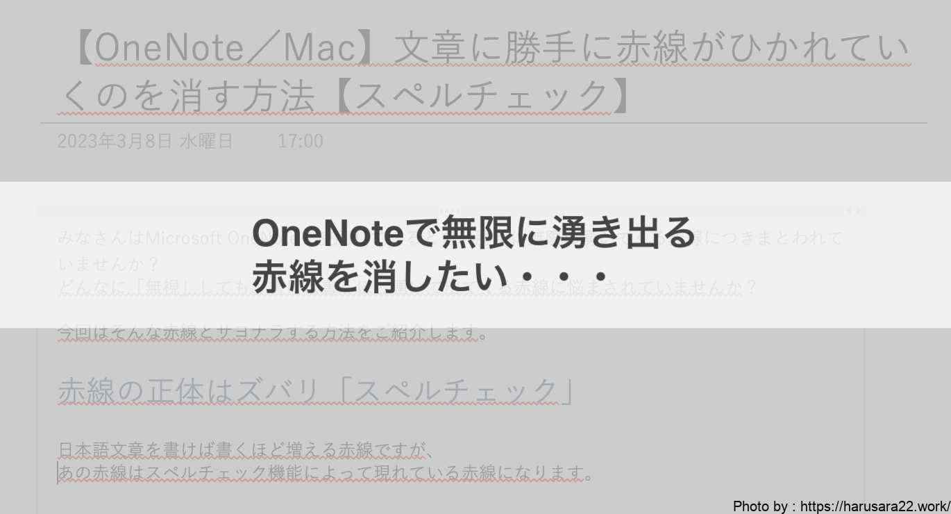 実は私はブログの記事をOneNoteに書いており使用頻度がそこそこありましたので、この赤線をだいぶ煩わしく感じていました。