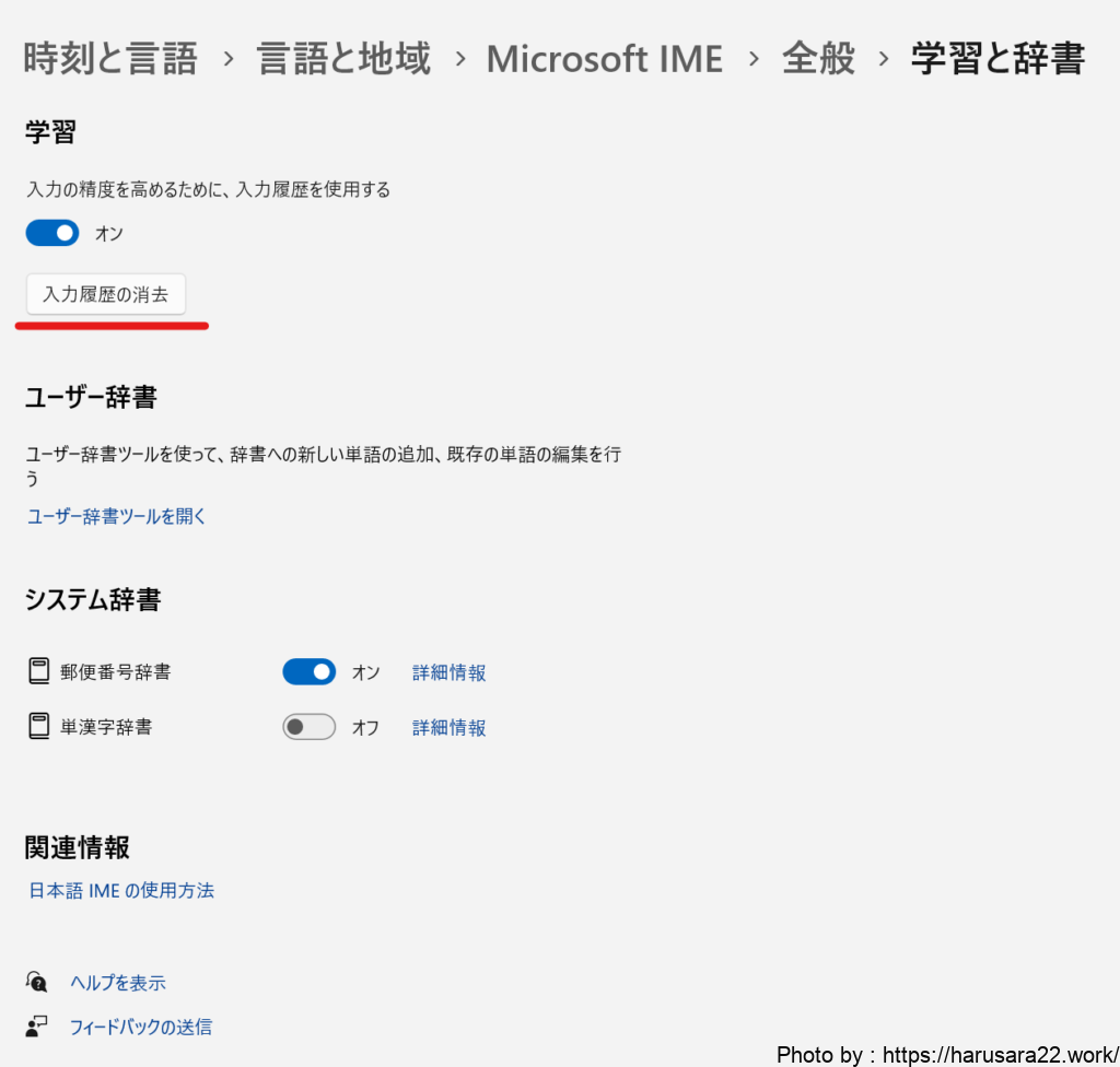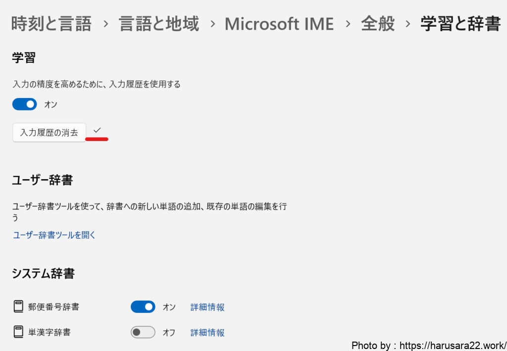「入力履歴の消去」のボタンがあり