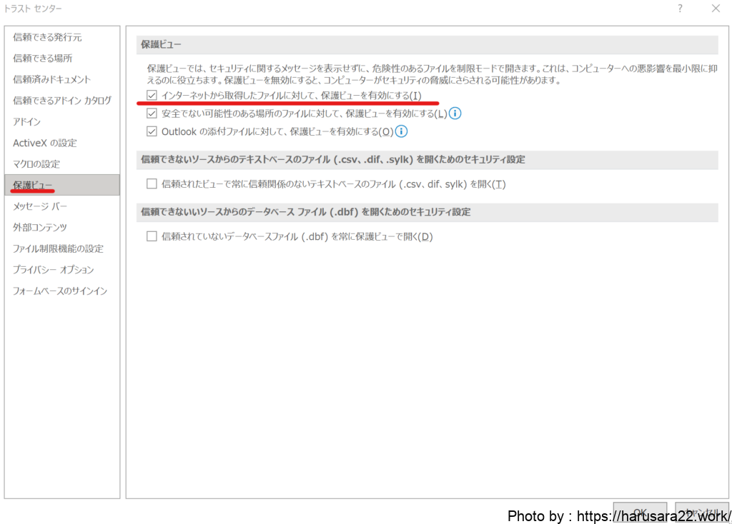 インターネットから取得したファイルに対して、保護ビューを有効にする
