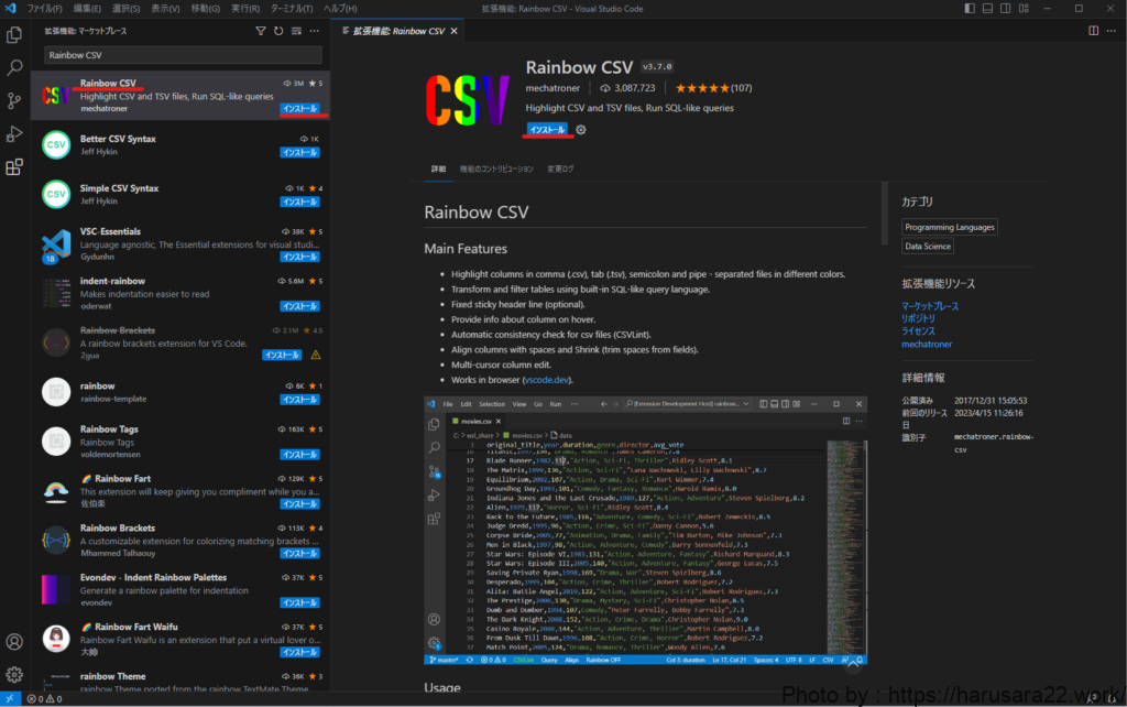 『Rainbow CSV』が入っていた方が