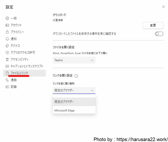 Teams側の設定を変更+Windowsの既定ブラウザ設定で