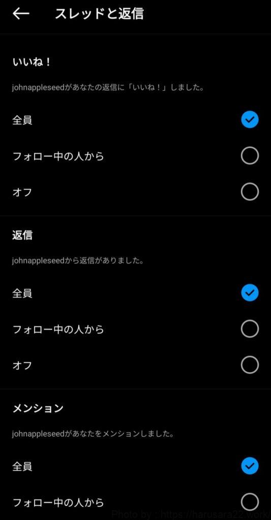 『スレッドと返信』から設定できる通知受け取り設定一覧
