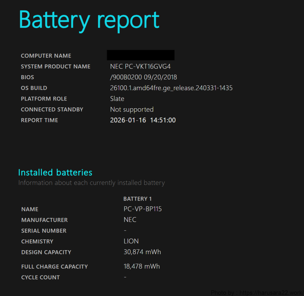 「Battery report(バッテリーレポート)」という便利な機能が標準で備わっています。