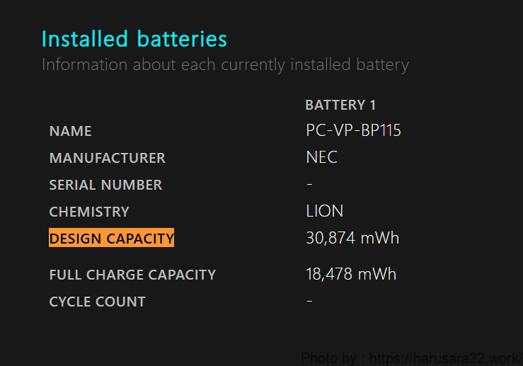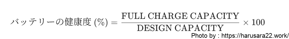 - DESIGN CAPACITY(設計容量):工場出荷時の、新品の状態でのバッテリー容量です。