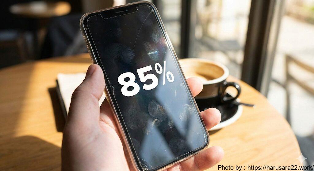 スマートフォンの設定画面で「最大容量 85%」といった表示を