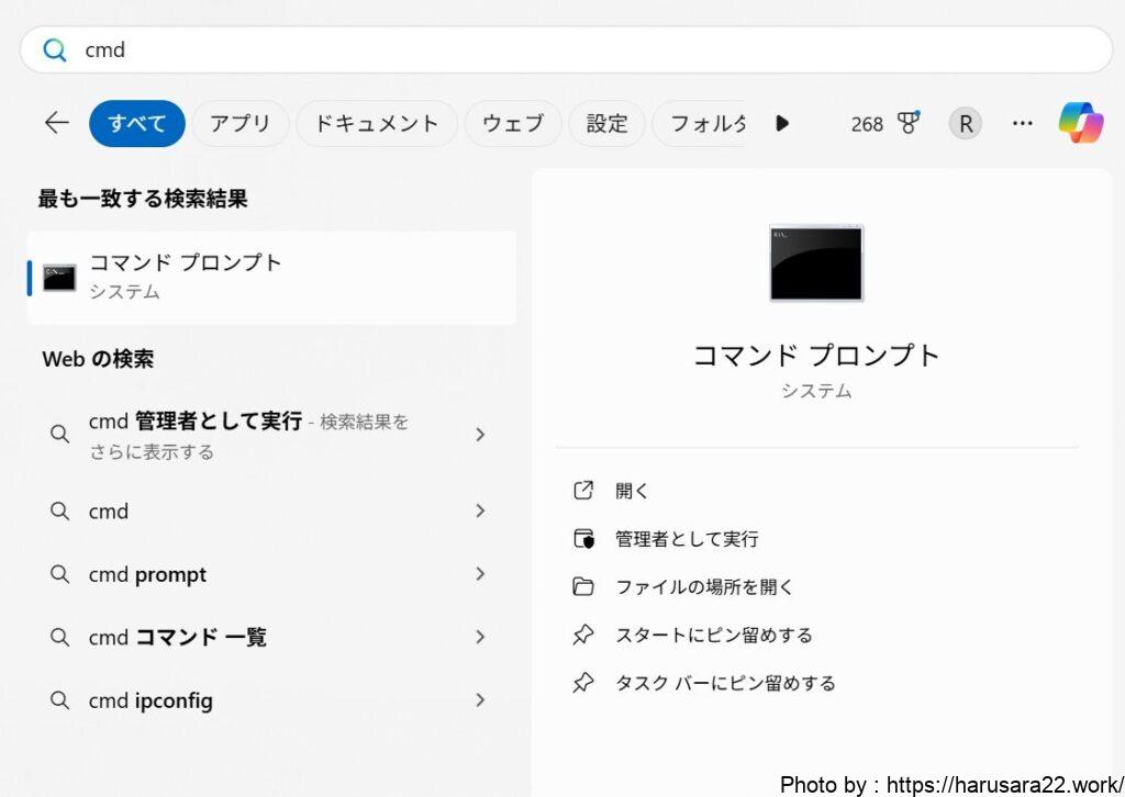 - 検索バーに「cmd」または「コマンドプロンプト」と入力します。