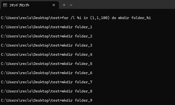 例)フォルダ内に「folfer_1~100」のフォルダを作るコマンド