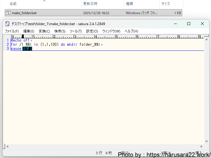 これにより、.batファイルをクリックするだけでフォルダの作成が可能
