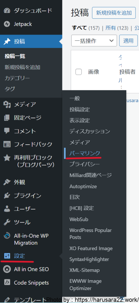 『設定』→『パーマリンク』をクリックします。